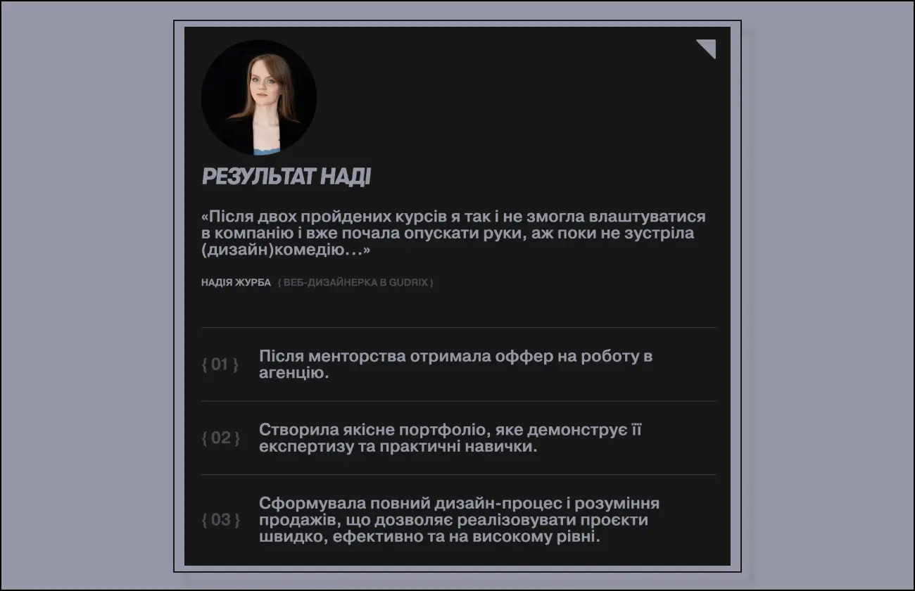 { 04 } Ментор на програмі (дизайн)комедія, на якому ділиться з вебдизайнерами, як зробити кардинальні зміни в карʼєрі. Більше про мене тут.